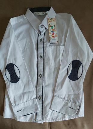 Сорочка біла з темно-синьою обробкою Усередині манжет чорний. На ліктях вставки