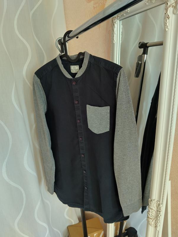 next custom design est.1982 original & authentic quality good s в розмірі по лейбі 13 years/ 158 cm ------ довжина по плечу по переду 68 ( по заду довша злегка), ширина під проймами рукаві 45, рукав від плечевого шва 57, відстань між плечевих швах 38 ------ ексклюзивна бавовняна сорочка горловина стійкою подовжентй прямий крій подол з легким заокруглення по бічних швах комбінування кольору та структури тканини горловина, рукава та кишеня в сірому відтінку з бавовняного трикотажу основа, графітова, котонове сорочкове полотно фото на моделі силуетне по крою