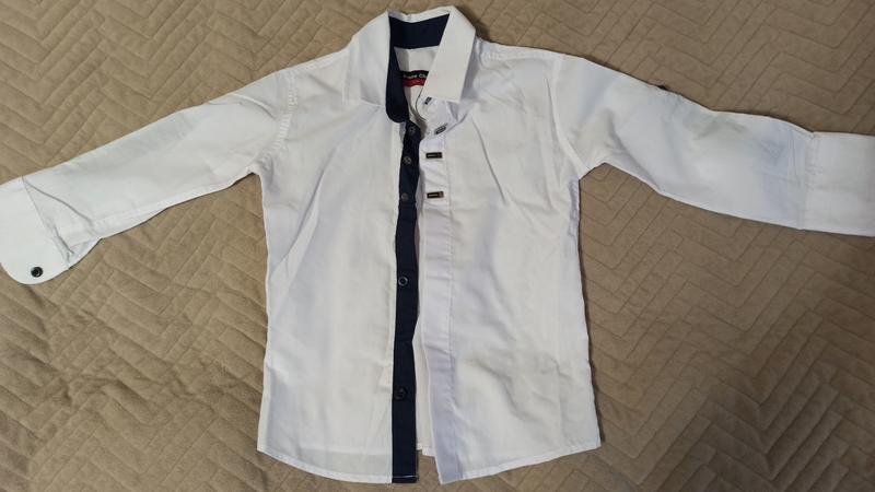 Сорочка біла з синіми акцентами. По бірці на 3 роки. Стан ідеальний. Рукав може бути довгий або підключений, фіксується на гудзик. Заміри: довж 41, рукав від плеча 34, під рукою 28, в плечах 39, в грудях 32,5.