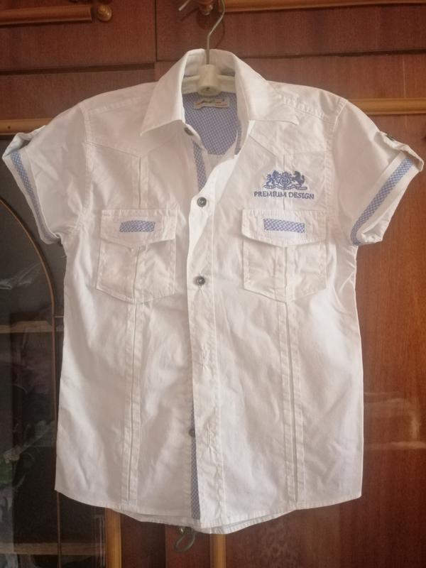 Белая праздничная рубашка, хорошего качества в красивом состоянии. Размер указан на рубашке 3-4роки, но сын в 6 лет, сладострастной телосложения, в ней шел к первому классу.