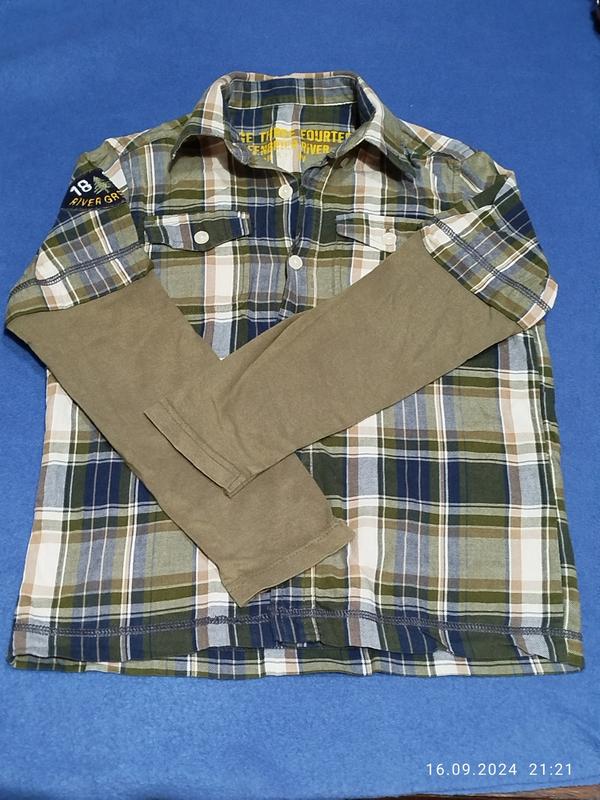Класна, приємна на дотик і якісна сорочка кольору хакі в чудовому стані на дитину 6 років. Довжина виробу по спинці від плеча 52 см, напівобхват грудей 39 см, довжина рукава 45 см. Тканина погано тягнеться. Модель 4852Б