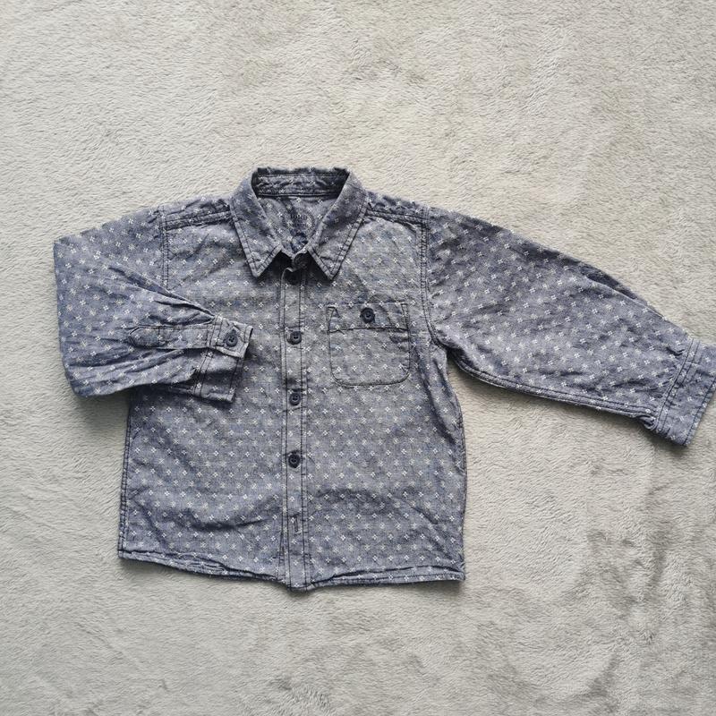 Рубашка ошатна нарядна колір під джинс з принтом. Виглядає охайно. Стан ідеальний, дуже добрий, без нюансів. Заміри : Плечі 27 см Ширина 34 см Довжина 33 найкоротша 39 найдовша Рукавчик 32/26 см