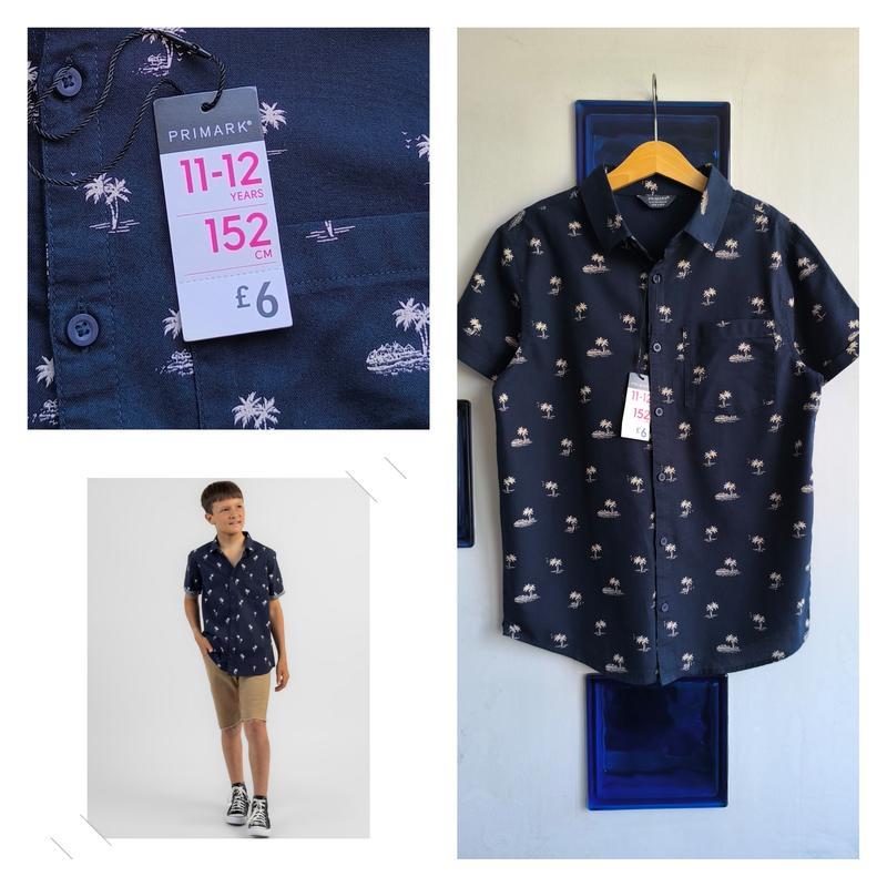 Літня рубашка гавайка від Primark, нова з біркою Універсальна модель для літа і відпочинку, прямий крій, скруглений низ, є нагрудна кишенька, з боків розрізи, склад: 100% полірована бавовна. По бірці на 11-12 років, зріст 152 см, звіряйтесь з замірами. Довжина 59 см Плечі 36,5-37 см НОГ 43,5 см Напівобхват по низу 43,5 см Рукав від плеча 15,5 см Рукав напівобхват 14,5 см