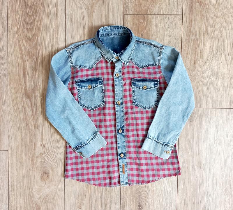 Легка котонова сорочка на ґудзиках, тоненький джинс. Довжина по спинці від горловини 51 см: рукав 41см; плечі 33 см; пог - 36см. Якість супер, тканина приємна до тіла, стан нової
