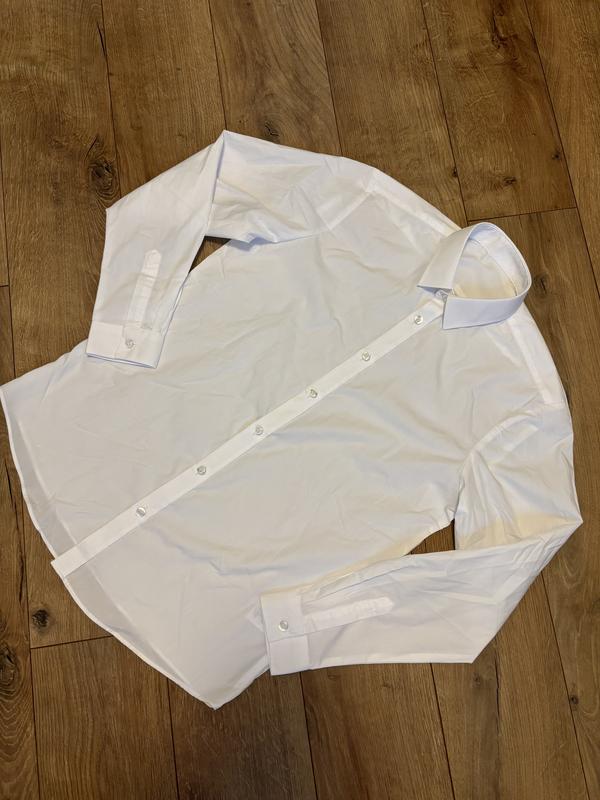 Біла сорочка в ідеальному стані. Склад: 65% поліестер, 35% котон. Заміри: Довжина 64 см Пог 48 см Рукав 58 см Від плеча до плеча 39 см