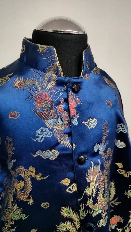 Сорочка з цупкого набивного жакардового атласу.Малюнок дракони має золотистий перелив. Довжина 58,плечі 37,рукав 48,обхват 88 см.Орієнтовно 134 ріст,але дивіться заміри,син був широкий в плечах для свого віку.