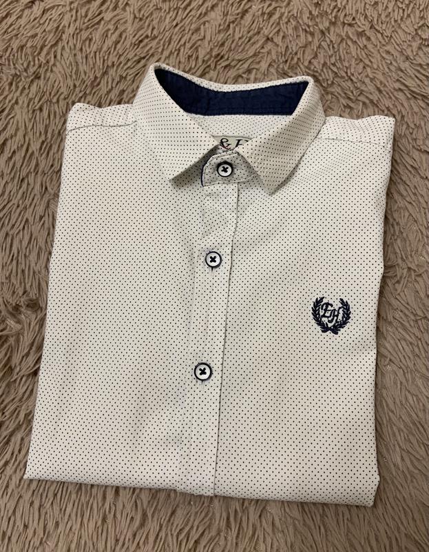 Сорочка E&H. Білого/строкатого кольорів, з емблемою-вишивкою. Є можливість зафіксувати рукава на ґудзик. Розмір на 134 см. Заміри: Довжина рукава 46 см Від пахви до пахви у лежачому стані 35,5 см По спинці 55 см