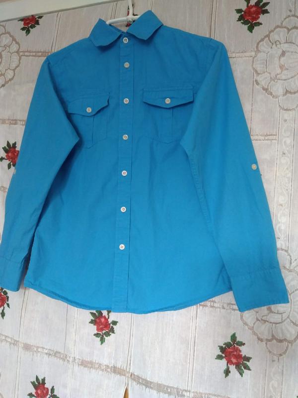 Шикарна сорочка красивого волошкового кольору,фірмова"Next",натуральна-100%коттон,фірмові рядки,відмінна якість,рукав довжиною-54см.закінчується манжетом,застібається на гудзик + підстьобується на гудзик,ззаду на спині красиві фігурні рядки,ширина в плечах-38см.,довжина-62cm.