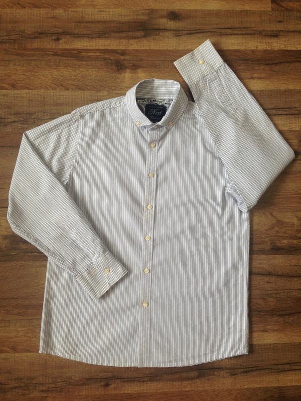 Класна сорочка в ідеальному стані!Склад 100% бавовна,на етикетці вказано 11 років,реальні заміри: довжина по спині 60см, ширина плечей 37см, плече 11,5 см, довжина рукава від плеча 52см, ширина 45см. Стан ідеальний,дефектів і слідів шкарпетки немає.