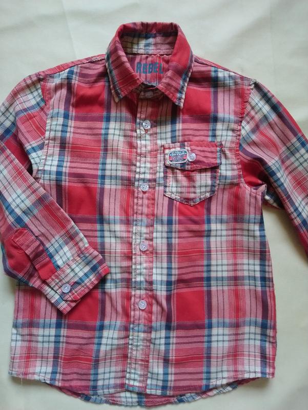 Сорочка з довгим рукавом фірми Rebel в дуже хорошому стані На вік 4-5 років ріст 110 см 65% поліестр і 35 % котон Довжина 47 см, В плечах 32 см, Напівобхват грудей 36 см Довжина рукава 36 см