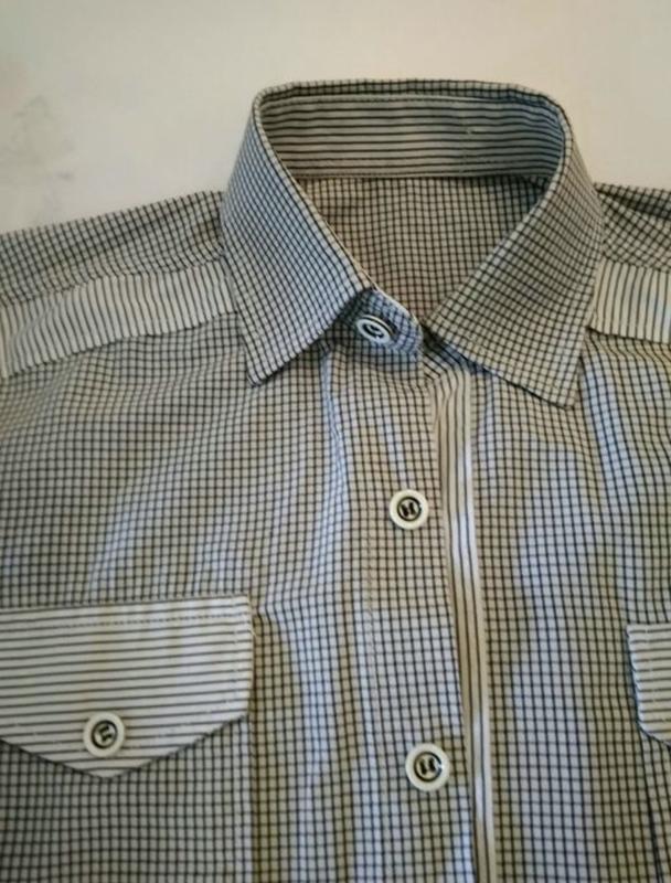 Рубашка в клеточку для мальчика с красивенными пуговицами. Замеры: ворот 31, ПОГ 44, длина 54, рукав 46,5, плечо 14.