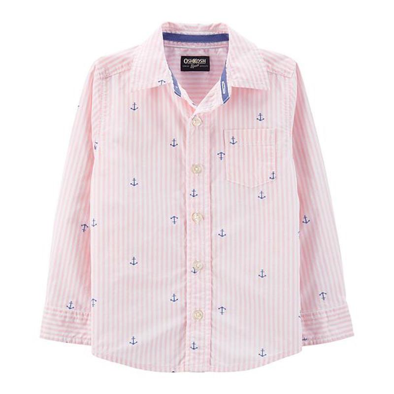 Рубашка для мальчика OSHKOSH на 2 года. Рубашка OshKosh B'gosh для мальчиков со сплошными полосками и деталями в виде якорей идеально подходит для особых случаев. Пуговицы спереди Длинные рукава Нагрудный карман Ткань поплин Якорные детали с полосками по всей поверхности Состав. 100% Хлопок. длина - 40 см, полуобхват под мышками - 31 см, длина рукава - 32 см, длина плеча - 7 см, по спинке от плеча к плечу - 25 см.