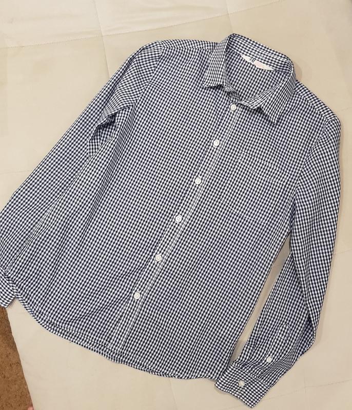 Гарна сорочка H&M в клітинку синього кольору. Купувала синові в Німеччині. Можна не прасувати, не мнеться. В ідеальному стані. Висота по спині 65 см, ПОГ 45 см, довжина рукава по плечу 58,5 см ( по внутрішньому шву 46 см). Made in Bangladesh. Склад 65% поліестер, 35% cotton.