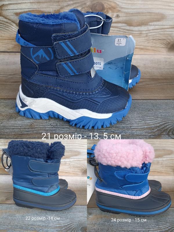 2 фото чоботи Lupilu 21 розмір- 13,5 см устілка 5, 8 фото чоботи kuniboo розміри 22-14 см та 24 -15 см всередині по всій галявині хутро, устілка не з'ємна, добре для наших зим у слякотну погоду.