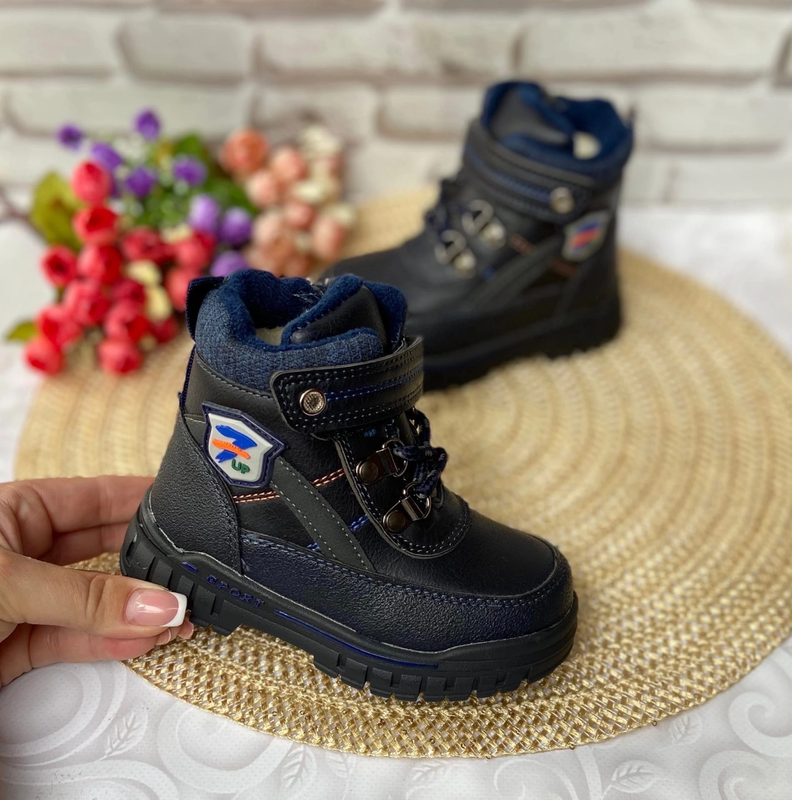 В наличии Зимние ботиночки Верх эко кожа Внутри густой мех Фиксация-шнуровка,липучка,сбоку молния Цвет темно-синий 27-17,7 см