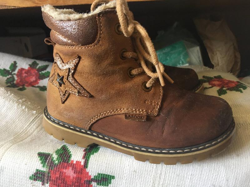 Черевики весняно-осінні,фірмові,коричневого кольору,комбінація натуральної і штучної шкіри,на шнурках,надійна,прошита,проклеєна підошва,з зовнішньої сторони,як прикраса-три різнокольорові зірки,підошва-17,5см.