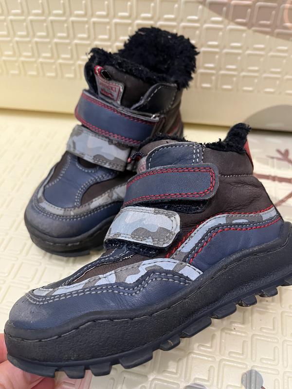 Чобітки гарної якості,купляла на минулу осінь/зиму,шкіряні,мʼякі. Ціна нових 1699 грн.(на Розетці).Виробник заявляє що взуття зимове,але підійде на теплу осінь і євро зиму. Хутро не дуже густе,але теплі,я додаткових зимових синові не придбавала. З світловідбиваючими полосами. З недоліків-збиті передки(на фото),але в житті не дуже помітно + можливо закремити.