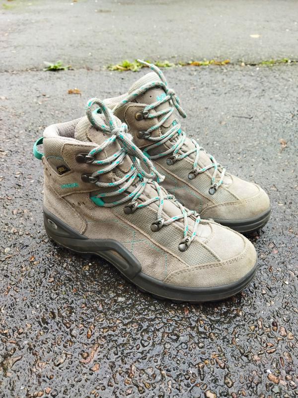 Модель: LOWA KODY III GTX MID JUNIOR Ніде нічого не відклеюється і не відривається, задники не протерті, підошва не зношена, верх без пошкоджень. Виконані із натуральної замші. Мембрана gore-tex тримає ноги у теплі та не дає промокнути. Устілка із загином на п'яті, довжина від краю до краю 23,6 см, ширина 8 см.