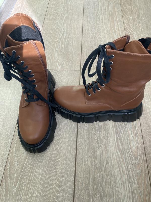 Дуже стильні ботинки з натуральної шкіри, легкі , безподобного коміру карамельного , подошва 4см з переду та 5 ,5 см сзаду см , демісізон , 25 см длина хоч і написано 38 ( на мене великі пролетіла з розміром) висота від пола 25 см високі.