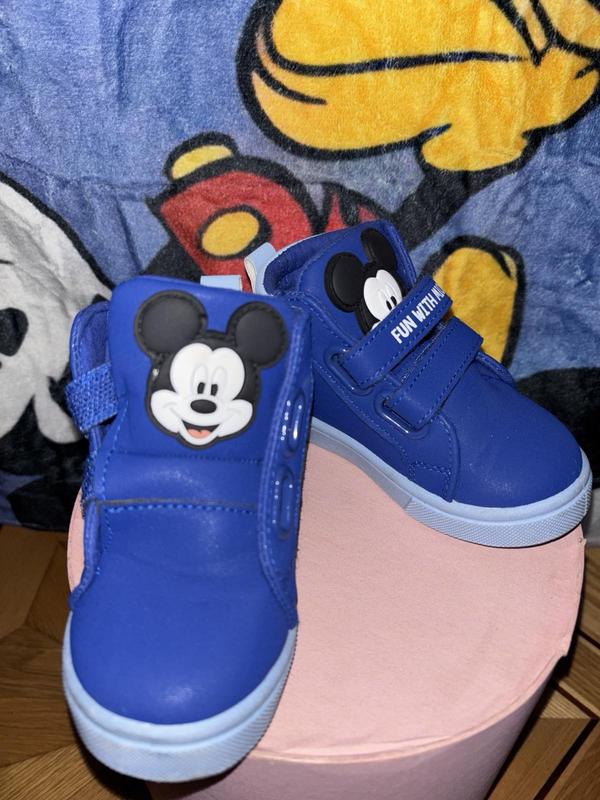 Демісезонні ботіночки на малюка Міккі Маус. Ззовні штучний матеріал, всередині тканина, на язичку прорезинений Міккі. Вдягнули один раз в будинку, але виявилися маленький розмір.