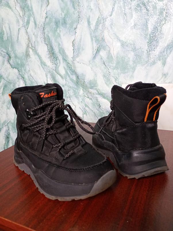 Термо черевики, ботінки зимові на хлопчика в чорному кольорі в чудовому стані, текстильний верх термо з поліуретановою підошвою. На шнурівці + робочий замочок. Всередині плюш та щільне штучне хутро, зовні - термо. Ніжкам буде тепло та зручно. Розмір - 33, устілка - 20,5 см
