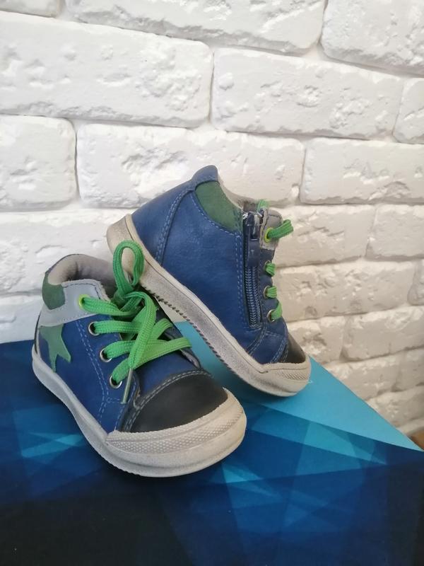 Классные ботинки-кеды на мальчика. Верх качественная еко кожа, внутри натуральная байка, прочная рельефная подошва. . Минимальные следы носки, немного стерт рельеф на подошве впереди на одном ботинке(на фото показано), подошва не белая, а с серой искусственной затертостью, после одного ребёнка, обували несколько раз. 23 размер- 14,5 см стелька