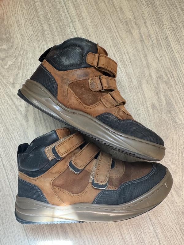 Демісезонні чоботи хайтопи з натуральної шкіри, дуже зручні та надійні. Мають захист носка та три липучки. Стан добрий, все ціле, але присутні потертості та сліди носки.