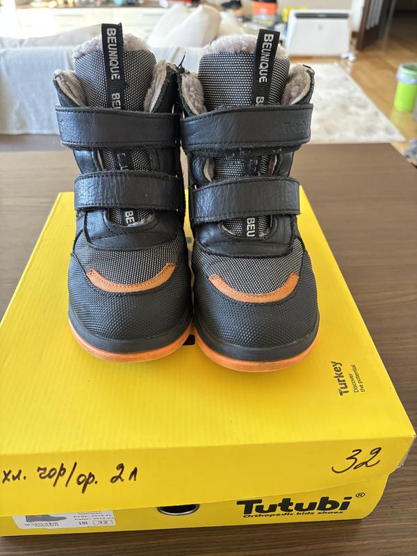 Дуже теплі зимові чобітки Tutubi. Ззовні шкіра та вставки жорсткої тканини для взуття, всередині підкладка з натурального хутра (цигейка). Носок прорезинений, для захисту від подряпин. Є дві липучки, що дозволяє швидко взуватися та регулювати висоту підйому ніжки. Носили 1 зиму, дуже хороший стан