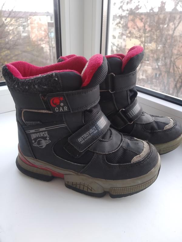 Зимові термо чоботи на хлопчика фірми Tom.m. Розмір 30, довжина устілки 19см. Ноги були теплі в них. Підошва ціла, липучки робочі. Дефект показала на останньому фото (з внутрішньої сторони затерлась тканина). Чудовий варіант для тих, кому потрібна пара взуття, яку не шкода для прогулянок у дворі.