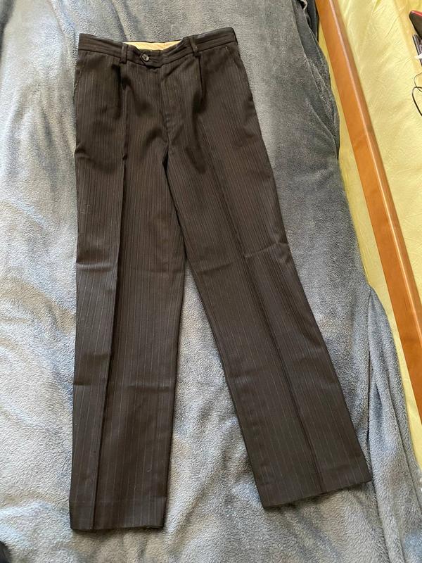 Колір - темно-сірий/чорний в тонко-світлу смужку Склад 45 % шерсть По передній половинці - підкладка ПОТ - 38 см Довжина по боці - 100 см Кроковий шов - 74 см Посадка спереду - 28 см Посадка ззаду - 38