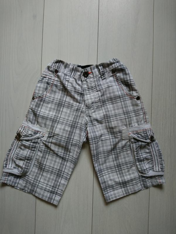 Шорті в дуже хорошому стані З дефектів немає закльопки на правій кішені з-заду Матеріал котон Пояс стягується резинкою на гудзичках На ріст 122-128 см Довжина 46 см Крок 26 см Півобсяг пояса 22 см і тягнеться до 30 см і стягується резинкою на гудзичках Півобсяг стегон 43 см