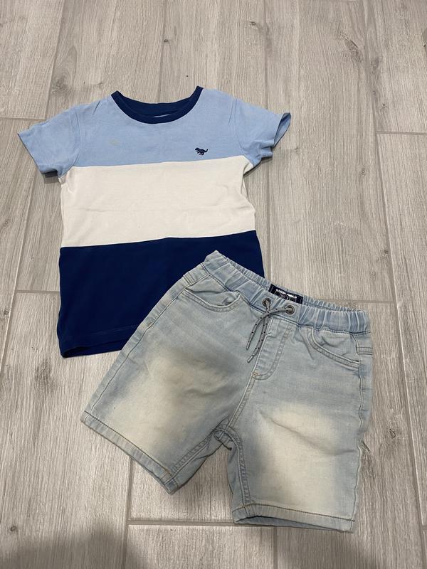 Джинсовые шорты в идеальном состоянии,размер 3-4, но большемерят, подойдут к росту 120-125,футболка 3-4 на такой же рост