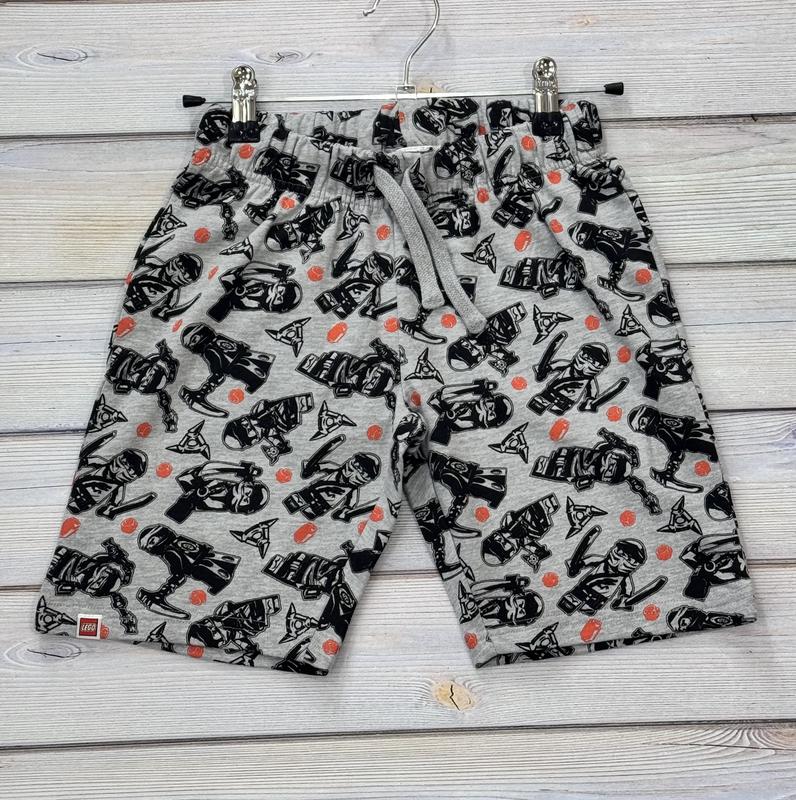 Шорти з яскравим принтом улюблених героїв Lego Ninjiago. М'які, легкі та зручні, ідеальні для літа . Пояс на резинці та затягується на шнурівку. напівобхват талії - 28 см напівобхват стегон- 42 см довжина -37 см довжина шагового шву - 17