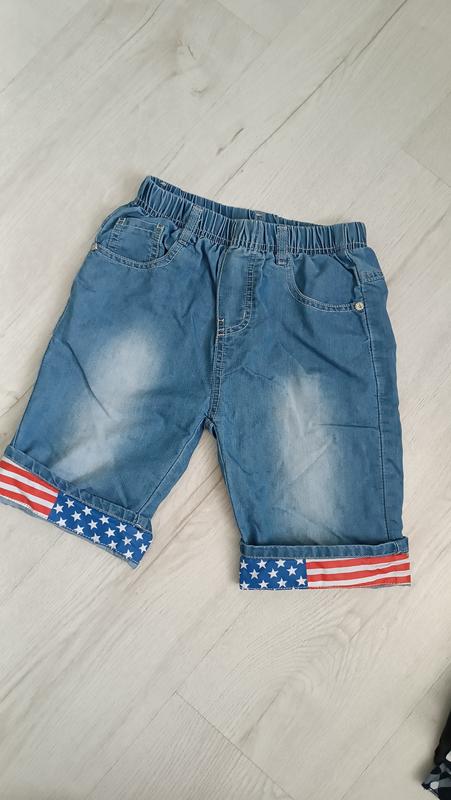 Шорти дитячі джинсові, кишені спереду та ззаду. Малюнок закочується, можна робити коротшими або довшими. Зручна резинка. Довжина 44 см в розпрямленому вигляді, закочені довжина 38 см. В талії п / о 26 см, резинка добре тягнеться до 35 см.