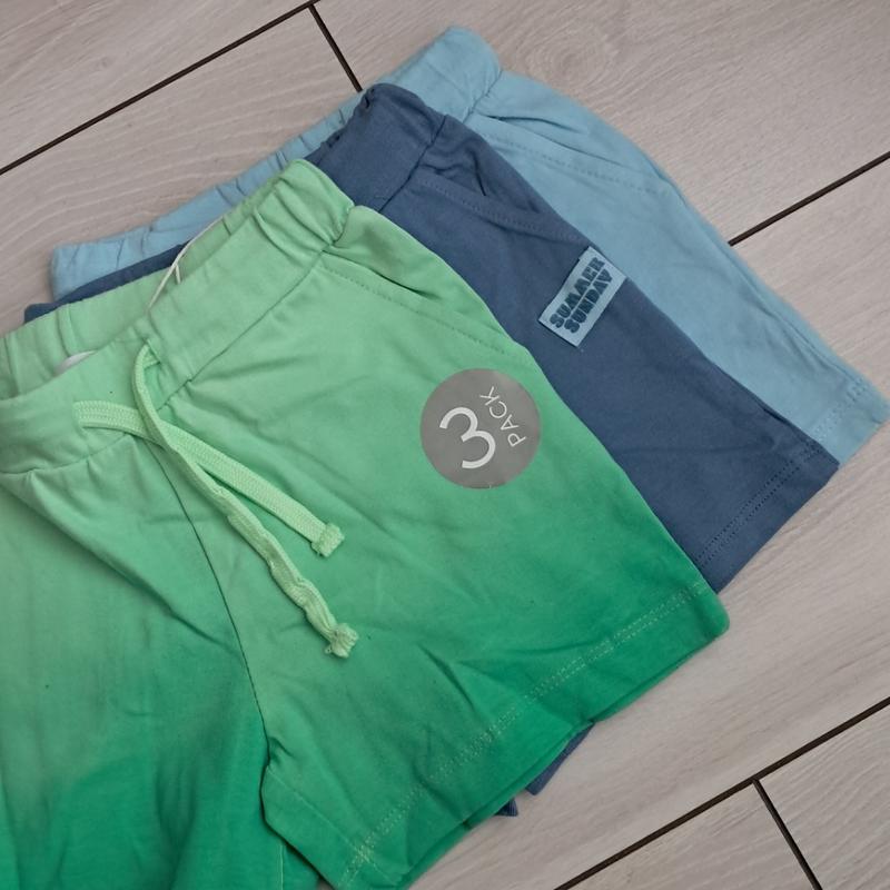 Набір із 3 пар дитячих шортів різних відтінків зеленого та синього кольорів. Вони мають еластичний пояс на шнурках . Кольори: Градієнтний зелений, синій та світло-блакитний. Особливості: Еластичний пояс на зав'язках, бічні кишені. розмір 98 2-3р 104 3-4р 122 6-7р 100% бавовна