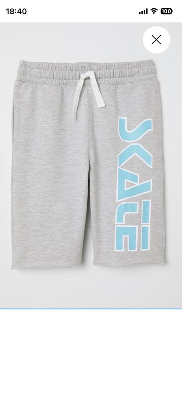 Сірі меланжеві шорти від H&M із великим вертикальним бірюзовим принтом «SKATE» на лівій штанині. Розмір-164см або 13-14 років