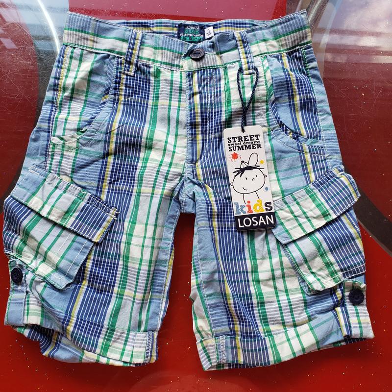 Losan, Іспанія, літні бововняни шорти хлопчику 2-3 р 92-98см, в блакитно зелену клітиночку ні білому фоні на поясі є утяжка нові з бірками , чудово на подарунок