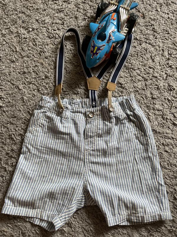 Стильні, легкі, літні шорти. Підтяжки знімаються. Пояс регулюється резинкою. Принт - дрібні біло-блакитні полоси. Будуть на хлопчика 2-3 рочки.