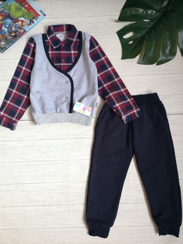 Нові костюми, ідеально на весну в садочок. Без утеплення. Заміри : На зріст 92: довжина кофти 35, ширина по грудях 28, ширина по низу 23, рукав 35. Штани : довжина 53, пояс 21, крок 35. На зріст 104: кофта довжина 40, ширина по грудях 33, ширина по низу 27, рукав 40. Штани довжина 59, крок 40, пояс 22.