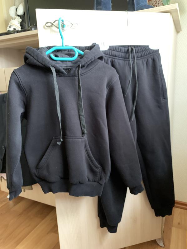Дуже теплий і якісний спортивний костюм на хлопчика. Вільного крою, з манжетами на рукавах і внизу брюк. Пояс на резинці і затяжці. Зручний подвійний капюшон. Колір чорний, не випраний, хоча носили часто і з задоволенням). На камеру не вдається коректно зловити колір. На колінах ледь-ледь присутнє висвітлення, але при умові що роздивлятися на рівні очей і при певному куті - на дитині взагалі не помітно.