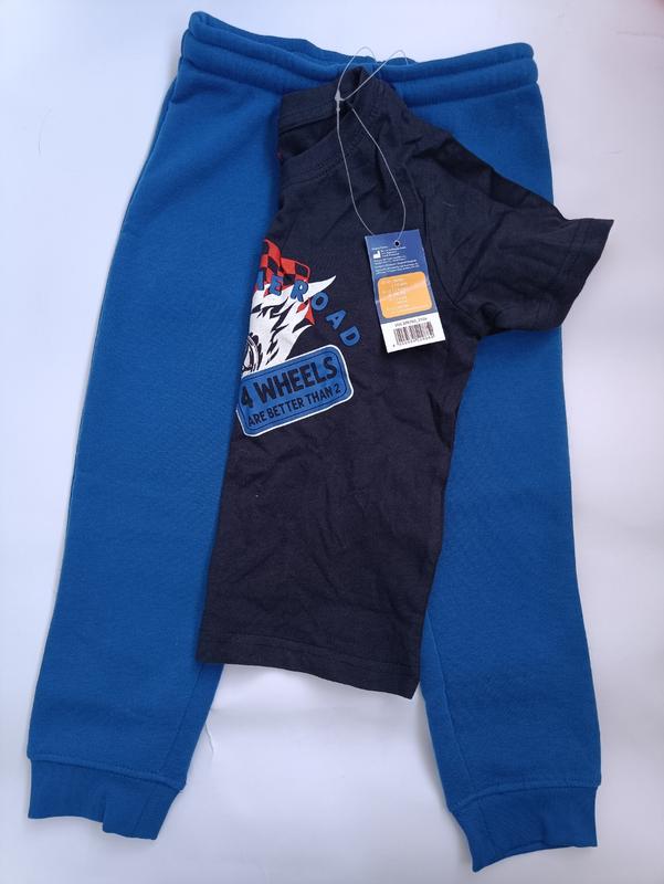 Новий набір Lupilu, котонова футболка та флісові штани джогери(на манжетах та з резинкою в поясі). Футболки в наявності 2шт. Штани довжина: 55см, ширина: резинки 26см Футболка довжина: 41см, ширина: 34см. Розмір по етикетці 98-104см(2-4роки).