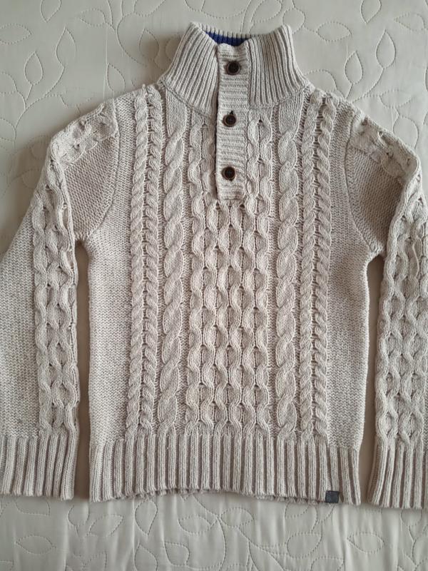 Стильний светр для хлопчика від H&M. В'язаний з бавовни, комір стійка і три гудзики для зручності одягання. В гарному стані, добре сидить на дитині. Довжина по спинці 53см, довжина рукава 55см, плечі 34см, ПОГ 40см. 50% бавовна, 45% поліамід, 5% вовна