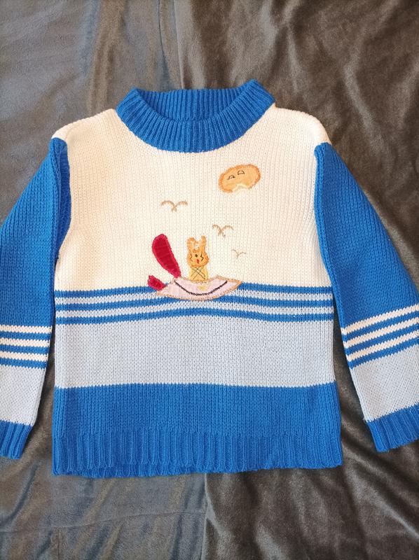 В'язаний светрик з аплікацією. Кольори яскраві, подекуди є ковтунці, присутні дефекти в'язки як на останньому фото.