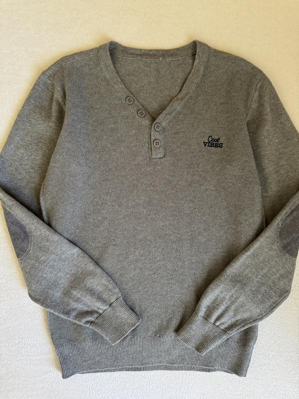 Стильний светр на хлопця від GeeJay. V-виріз. Колір світло-сірий меланж з вишитим написом спереду. Тканина вʼязка бавовняна, тягнеться. 100% бавовна. Розмір 140 (8-10р). Заміри: Плечі - 34см Груди напівобхват - 38/39см Рукав - 51см Напівобхват низу - 31см Довжина - 50см Стан ідеальний! Одягався пару раз! Відправка кожен день Нова і Укрпошта