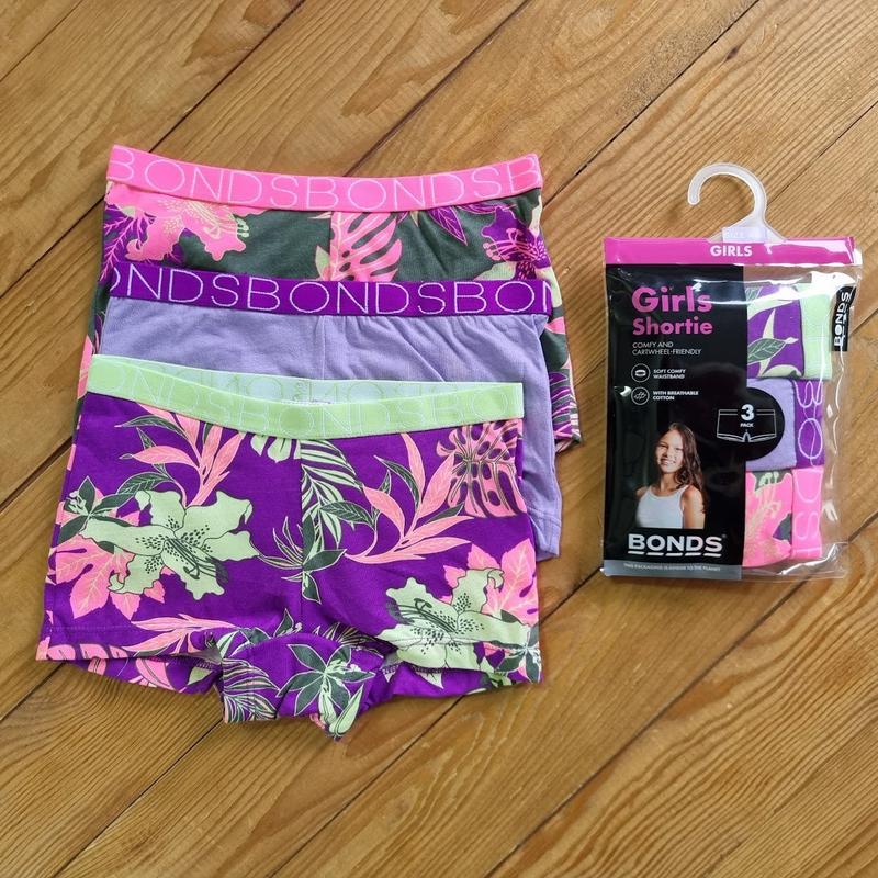 Трусики-шортики для дівчинки з трикотажного полотна. У комплекті 3 штуки. Колір: Фіолетовий, бузковий, хакі. Склад: 100% бавовна. Вік 4-6 років, об'єм талії 55-57 см.