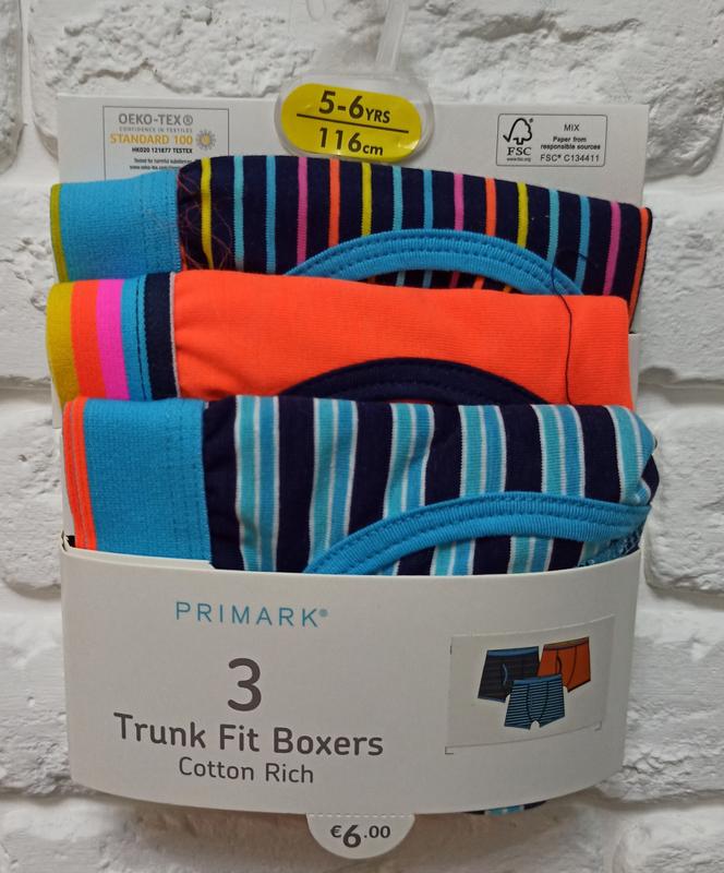Комплект трусиків Primark з 3 штук . Розміри: 116(5-6) :ширина по талії 25см, довжина 20см 122(6-7):ширина по талії 26см, довжина 21см Склад тканини: 89% котон, 4% поліестер, 7% еластан Країна-виробник: Китай