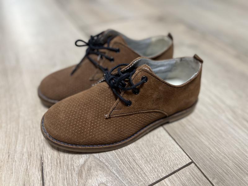 Продаю туфлі на хлопчика. Нові, ні разу не взув по тій причині, що не підійшли за розміром. Туфлі легенькі, натуральна перфорована замша, внутрі- тканина. Розмір 32. Довжина підошви ( на фото)- 23см.