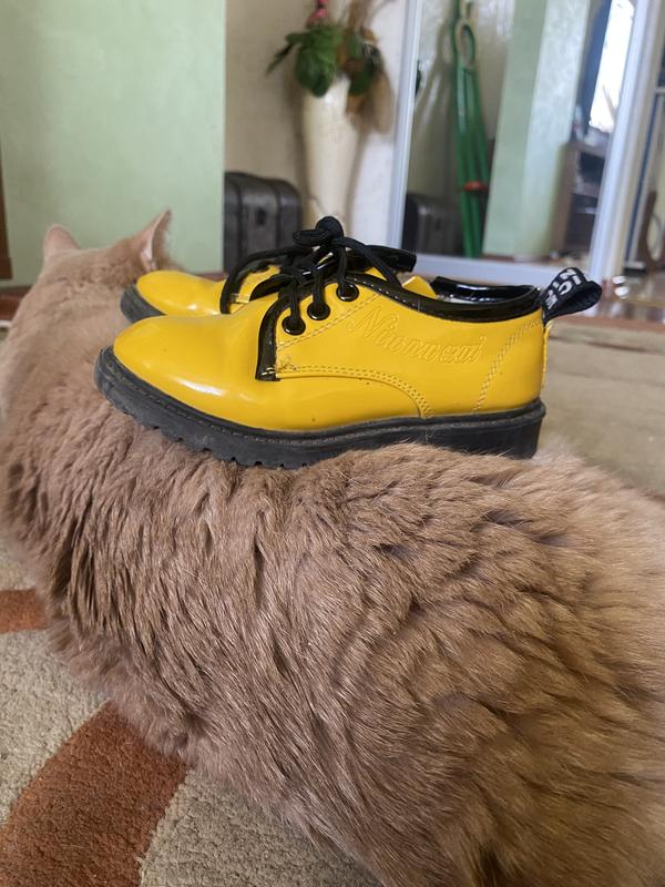 Туфельки жовтого кольору , на шнуровці, с боку на молніі, лакові.
