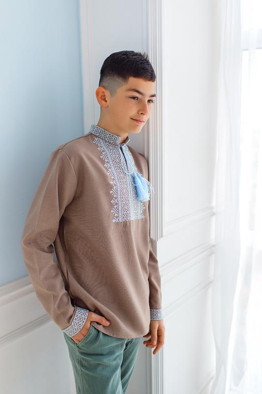 Сучасна сорочка-вишиванка для хлопчика. Виготовлена на домотканому полотні кольору капучино, оздоблена вишивкою сучасного орнаменту)