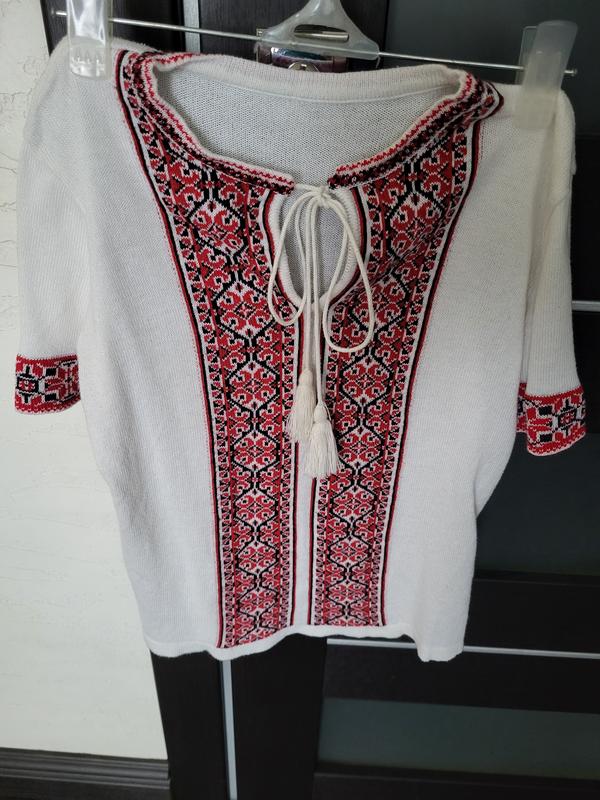Вишиванка, короткий рукав, трикотаж. Не мнеться парктично( що дуже зручно, дитина завжди охайно виглядає До і Після свят), приємна тканина до тіла) Підходить під все, будь -який низ) тягнеться. Указан розмір 122,128 Може бути і на 130. довжина 48, під мишками 36 , тягнеться добре